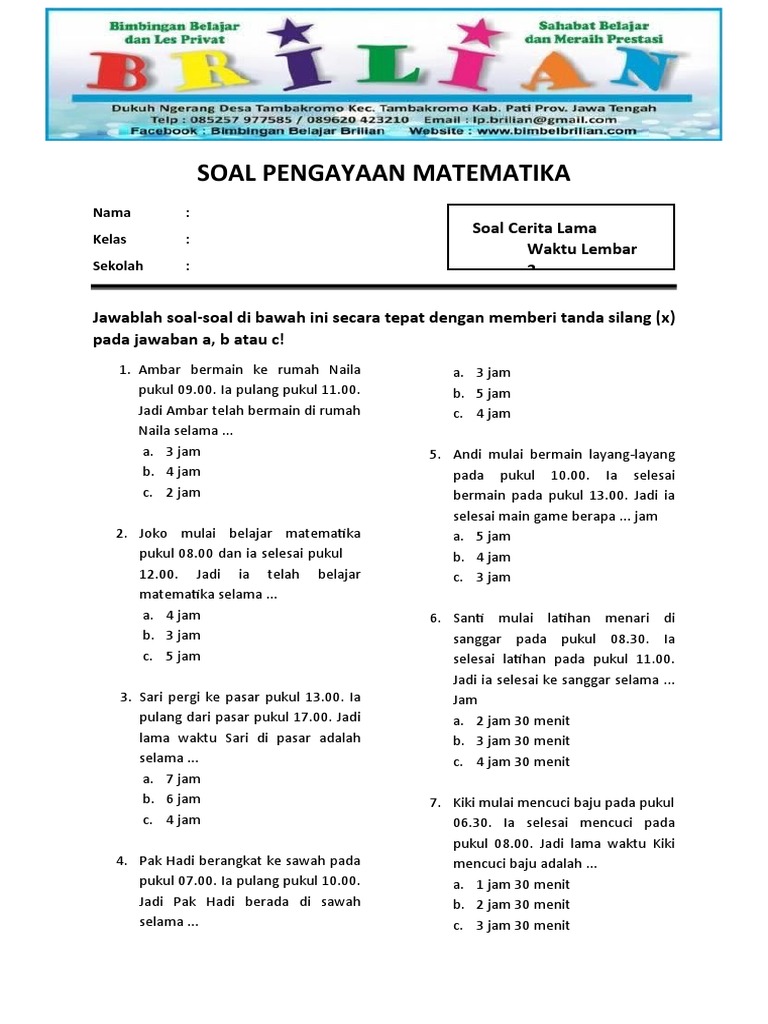 Soal cerita waktu untuk kelas 3 SD biasanya berfokus pada beberapa jenis perhitungan, antara lain: